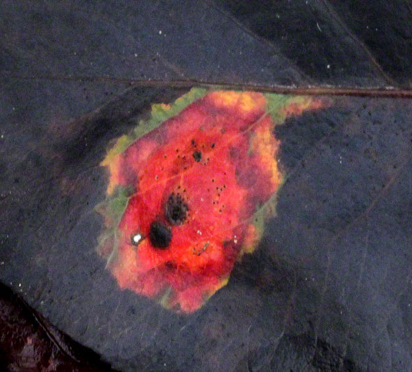 Am 15. November leuchtete mir aus einem dunklen Blatt ein Farbenspiel aus Rot, Gelb und Grün entgegen; kleine Blüten sind auch jetzt noch zu sehen, und Pilze wachsen aus dem braunen Laubgrund. Die Brücke über die Höhenstraße soll uns zu keinem Irrweg führen - davor warnt eine Baum-Inschrift! Und aus der Rinde blicken uns zwei Augen an (green brother is watching you).