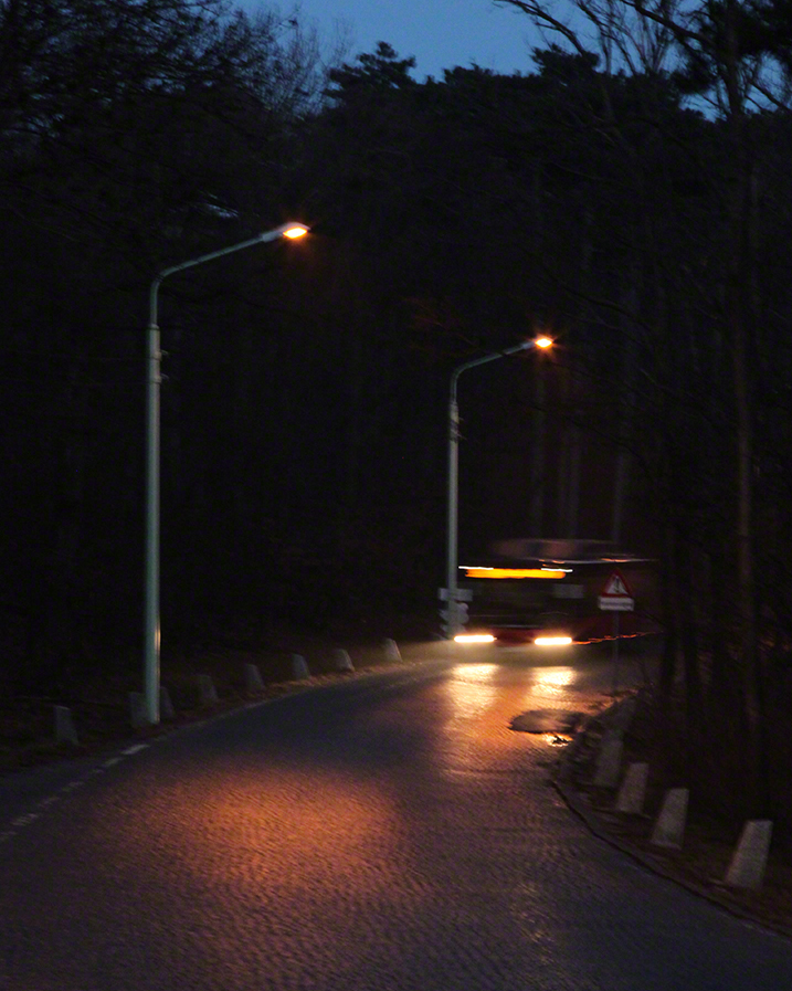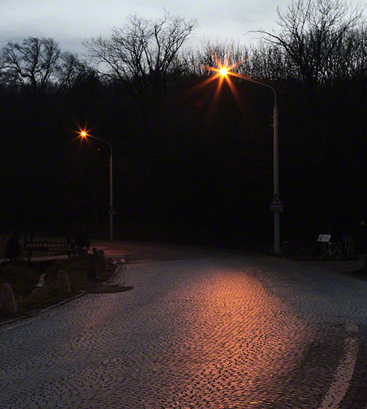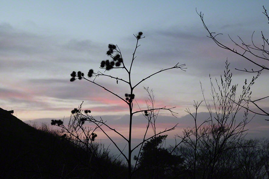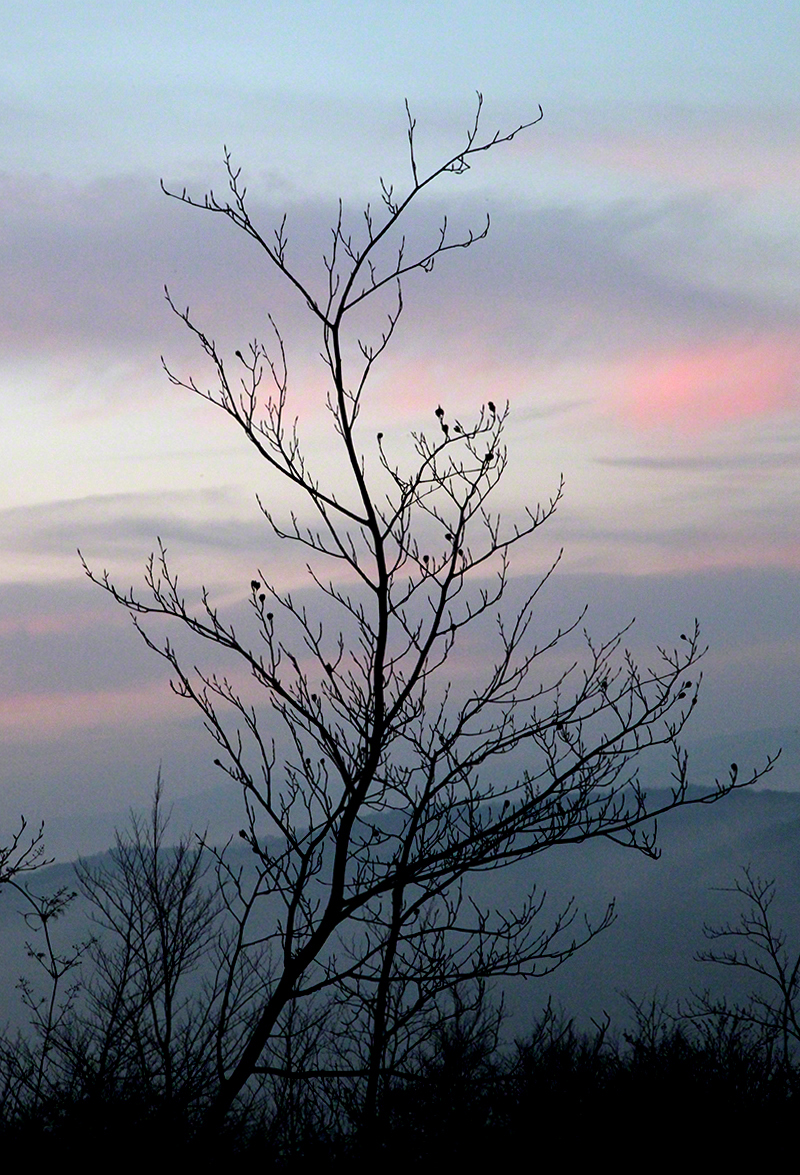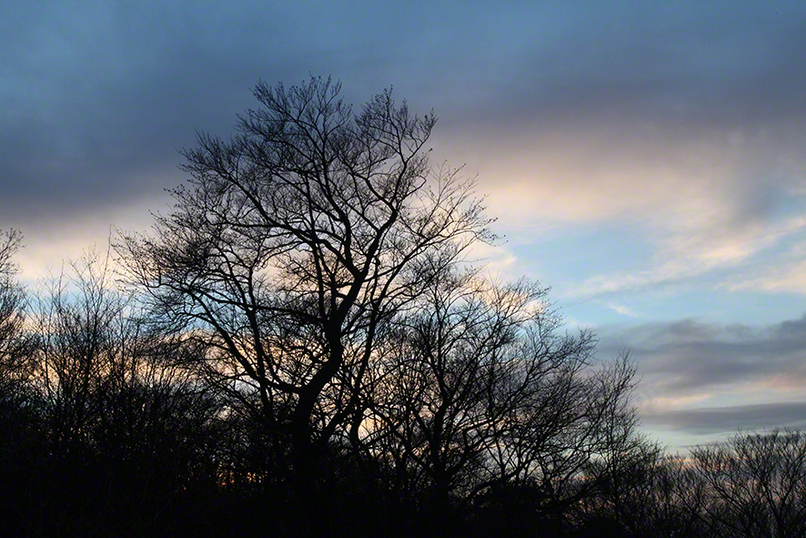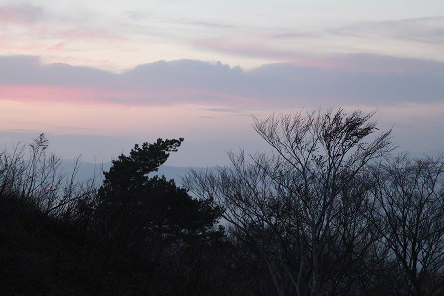 Abendstimmung bei der Elisabethwiese (Hütte am Weg / Josefinenhütte) am 3. Jänner. Bäume und Pflanzen stehen dunkel vor einer Symphonie aus Blau, Violett, Grau und Rosa mit vielen zarten Zwischentönen und Schattierungen. Wolken bilden weite, stetig wechselnde Gebirgszüge. Das Pflaster der Höhenstraße wird unter der Straßenbeleuchtung rötlich sichtbar, und endlich kommt der Bus.