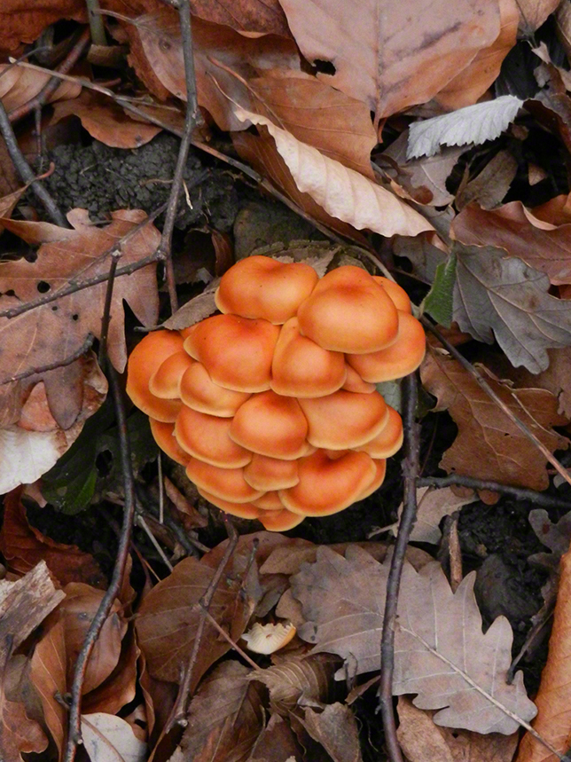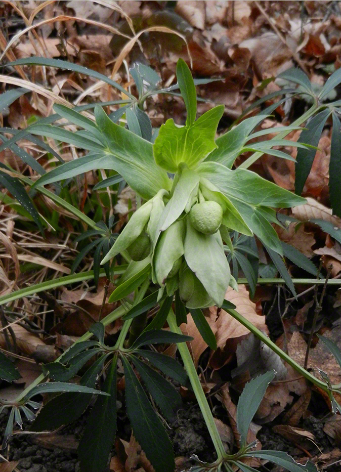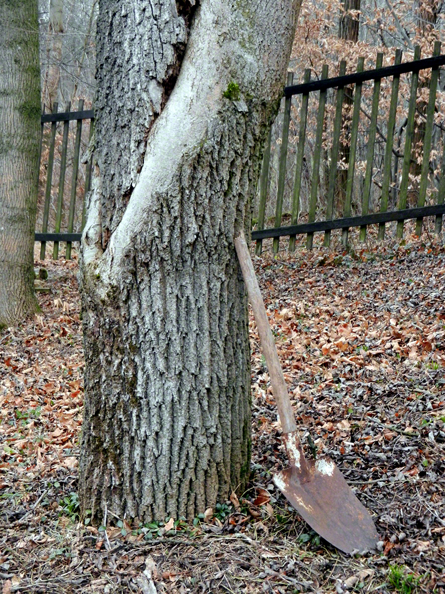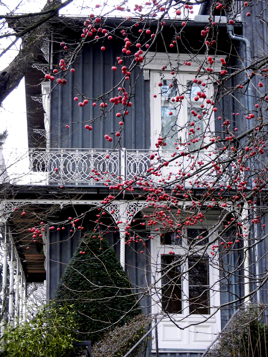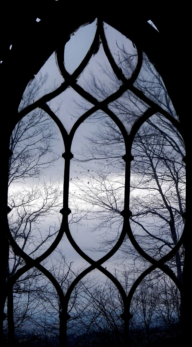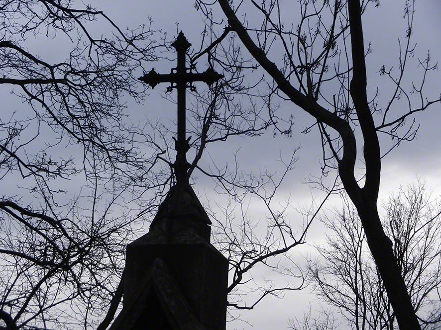 Es ist kaum zu glauben, was man an einem 5. Jänner noch alles finden kann: Zweige mit roten Beeren vor einem Historismus-Gebäude (Kahlenberg), eine grüne Pflanze mit ihren kugelrunden Knospen (Helleborus foetidus, die "Stinkende Nieswurz"), ein Leberblümchen (!), eine Pilzfamilie. Es war eigentlich ein Schlechtwettertag, düster, mit einigen Regentropfen, aber doch mit einem Blick in die Weite; und am Baum lehnt schon die Schaufel für die Frühlingsarbeit. Das Maßwerkfenster eines Mausoleums spiegelt das Astwerk der Umgebung, und das Kreuz ragt ins schwarze Geäst des Abendhimmels.