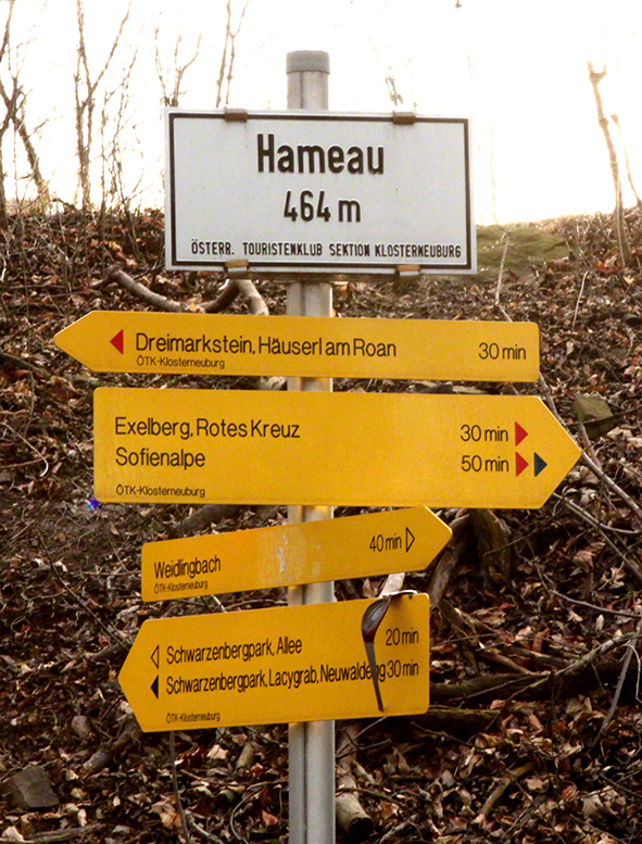 11. Jänner 2014: Durch einen Hinweis bin ich auf die "Rundumadum"-Wanderwege (Grüngürtel Wiens) aufmerksam geworden; den Bereich der Wege 1 und 2 bin ich ohnehin schon oft gegangen, und daher habe ich mir an diesem Tag den 3. Weg vom "Häuserl am Roan" zur Marswiese vorgenommen. Es ging über ziemlich schlammige Pfade, aber Farne, Moose, Rinden und Boviste sorgten für Abwechslung. Eine Wege-Kreuzung mit vielen Wegweisern führte mich schließlich zum Hameau. Zur Fortsetzung