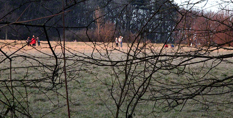 Wienerwald, 14. März 2014, Fortsetzung: Auf der Wiese "Am Himmel" blühen unzählige weiße Blumen (Hirtentäschel?). Es dämmert schon, und das Licht der untergehenden Sonne streift die Spiegelungen der Bäume im Weiher, taucht die grünen Algenflecken in schimmerndes Gold. Aus dem Wald heraus ein Blick in die Landschaft – auf die verstreuten großen Felsblöcke setzt man sich gerne. Der Kinderspielplatz ist immer noch von buntem Leben und Treiben erfüllt. Ganz nahe davon und gänzlich unbemerkt blüht der Gelbstern neben den blauen Leberblümchen. Auf der Cobenzlwiese sind kleine Gruppen hinter dem Geäst sichtbar.