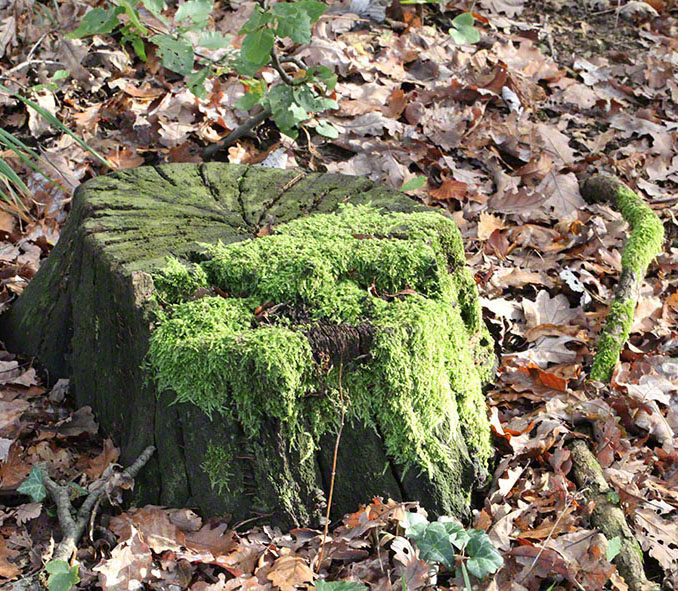 ein bemooster Baumstumpf wie eine grüne Oase in einem braunen Blättermeer